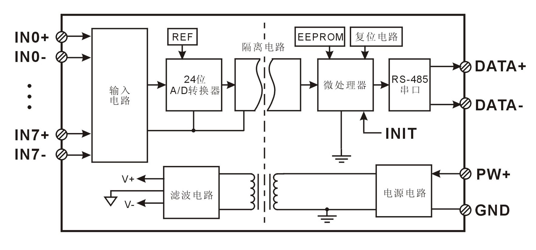 24位采集精度,8路模擬信號輸入。產品出廠前所有信號輸入范圍已全部校準。在使用時,用戶也可以很方便的自行編程校準。具體電流或電壓輸入量程請看產品選型。